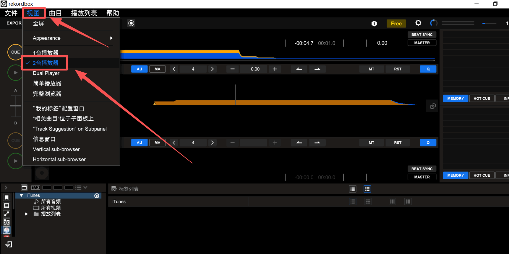 rekordbox 的双播放器布局(2 Player)功能允许用户同时加载两首曲目,并快速检查它们的兼容性,找到最佳混合点。通过调节播放器 A 和 B 的混音平衡,可以实现无缝过渡。此外,rekordbox 还支持节拍同步、键同步等功能,帮助 DJ 更轻松地完成混音。