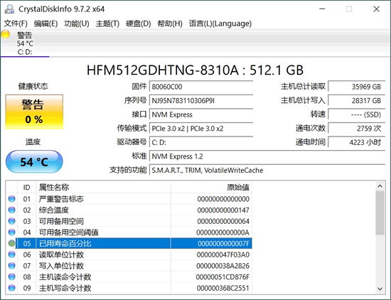 CrystalDiskInfo 能够实时检测硬盘的健康状态,包括温度、通电次数、已用寿命等,并翻译成我们能看懂的颜色和数字。一旦发现硬盘快要“寿终正寝”,CrystalDiskInfo 就会提前让我们备份数据,避免突然死机导致重要数据丢失。