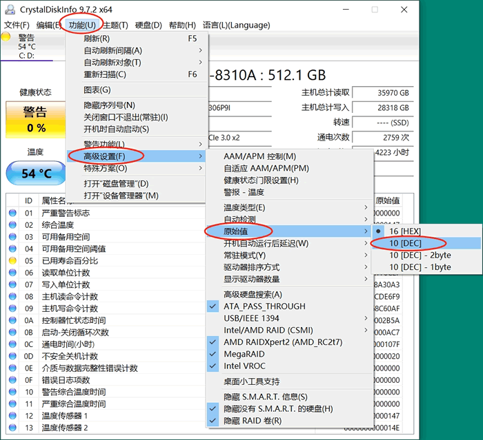 2) 在 CrystalDiskInfo 下方的列表中,可以看到硬盘的工作情况,以及各项数值是否健康。默认情况下,显示的数值都是十六进制的,可以修改为我们更熟悉的十进制,修改方法如下图所示: