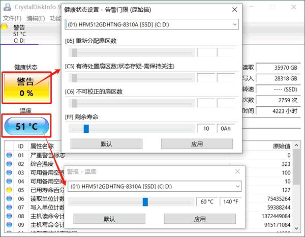 1) 如下所示,点击界面偏左侧的“健康状态”图标,可以修改警告的临界值,当健康状态超过设定的临界值时,CrystalDiskInfo 会主动发出警告提醒我们: