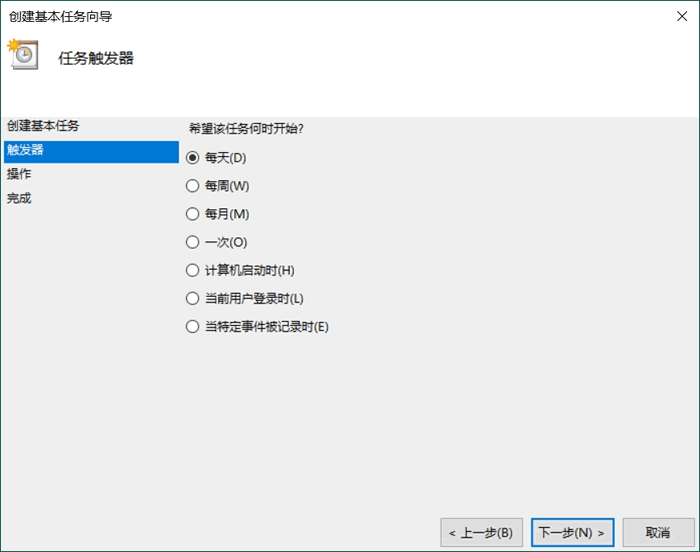 ④ 选择“定期”触发器,然后设置所需的频率(例如,每天、每周等),点击“下一步”: