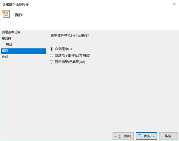 ⑥ 选择“启动程序”操作,然后点击“下一步”: