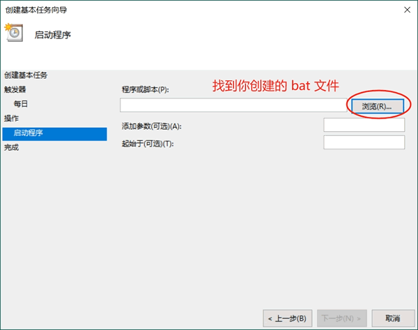 ⑦ 浏览并选择你创建的 RunCrystalDiskInfo.bat 文件,点击“下一步”: