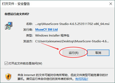1) 我使用的是 Windows 系统,下载名为“MuseScore-Studio-4.6.5.253511702-x86_64.msi”的安装包文件,双击启动它,如果系统弹出下图所示的安全警告窗口,点击“运行”即可: