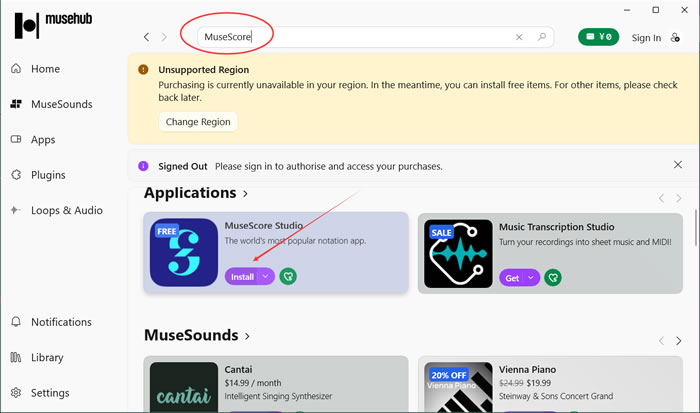 5) 打开 MuseHub,按照下图所示安装 MuseScore:
