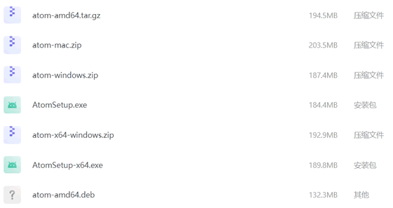 这里为大家提供了 Atom 最新版的安装包:网盘中包含了适用于 Windows、Linux 和 Mac OS 多个平台的 Atom 安装包,如下图所示: