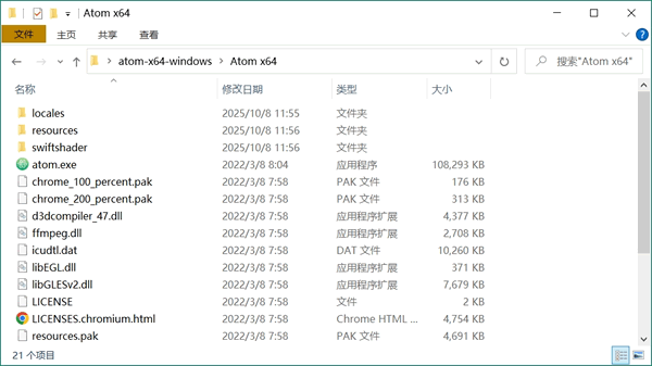 笔者是 Windows x64 平台,下载得到 atom-x64-windows.zip 压缩包,解压后的文件夹如下图所示: