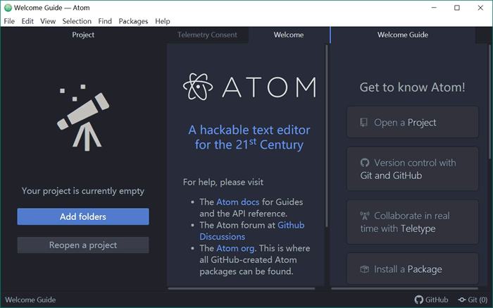 从中找到 atom.exe 并双击,Atom 就轻松启动了,Atom 的主界面如下图所示: