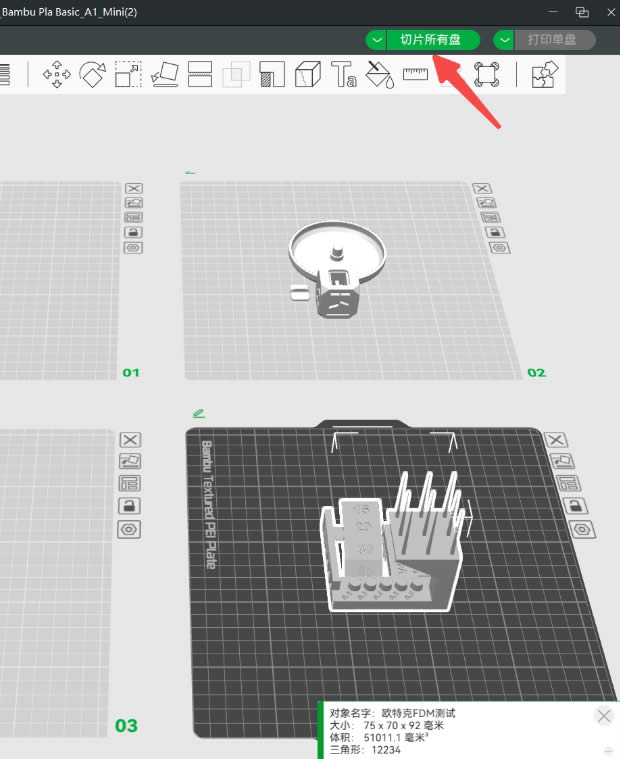 点击屏幕右上角的切片单盘。如模型文件包含多盘,可点击屏幕右上角的切片所有盘。
