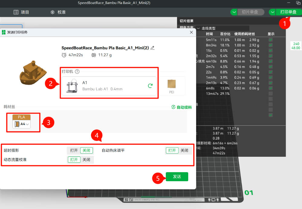 点击屏幕右上角的打印单盘,屏幕将弹出一个发送打印任务窗口。选择要发送的打印机,使用的耗材,以及打印机在打印开始前是否执行某些功能,如热床调平、流量校准等。选择完成后,点击发送,即可开始打印。
