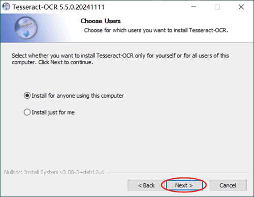 1) 下载得到 tesseract-ocr-w64-setup-5.5.0.20241111.exe,双击运行,保持默认的 English 语言,点击“OK”:
