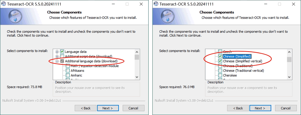 5) Tesseract OCR 默认是不识别中文的,这里我们需要手动勾选上,如下图所示。当然,大家可以把所有感兴趣的语言都勾选上。然后点击“Next”: