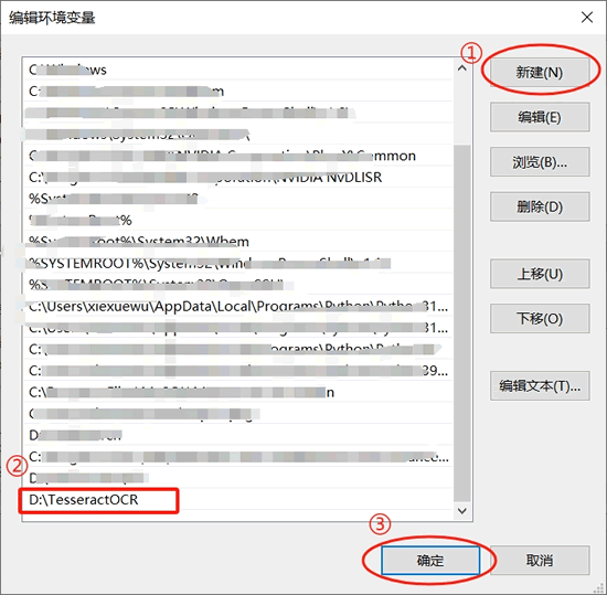 ④ 在 Path 系统变量中,添加 Tesseract OCR 的安装路径,比如笔者将它安装到了 D 盘下的 TesseractOCR 文件夹里: