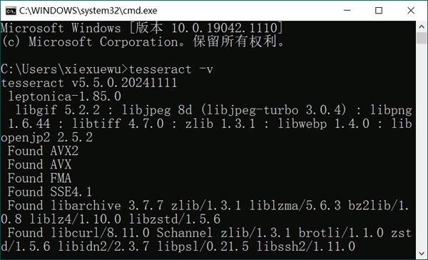 输出了 Tesseract OCR 的版本信息,表示安装成功了,接下来就可以使用 Tesseract OCR 识别图片了。