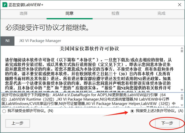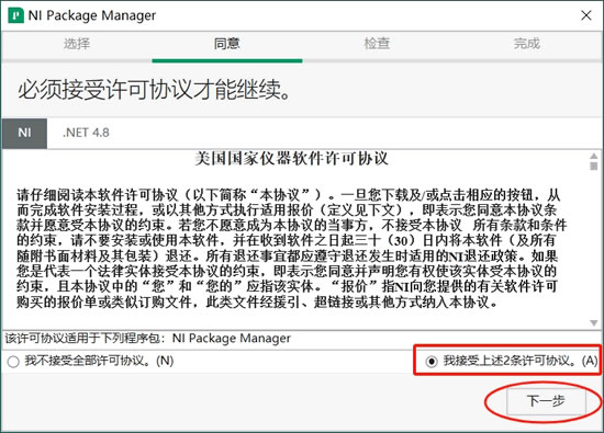 3) 双击 Install.exe,开始安装 LabVIEW,勾选“我接收...”,然后点击“下一步”:
