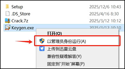 15) 安装完成后,还需要进行授权配置。找到下载的 Crack.7z 压缩包,解压后得到名为 “Keygen.exe” 的安装程序,右键“以管理员身份运行”: