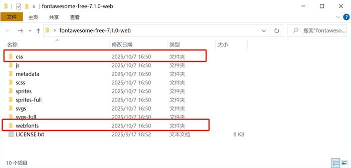 1) 解压下载的 fontawesome-free-7.1.0-web.zip,内部的文件如下图所示: