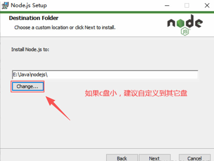 3.这里建议更改为自己想要的的安装目录,然后点next(可以自己先建好安装目录,我这里是提前建好的一个目录:E:\Java\nodejs)