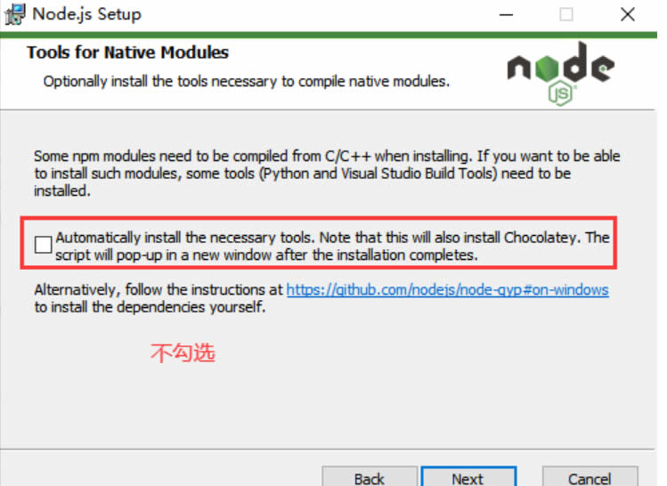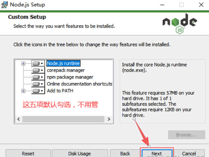 4.这里有五个选项,有时间可以看一下,就是安装的时候会安装一些组件和npm,同时会添加环境变量,右侧有说明。我们直接点next