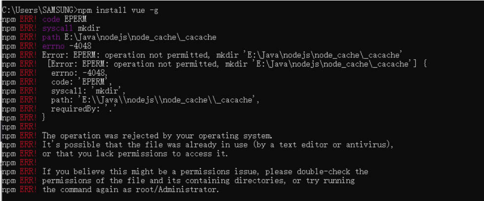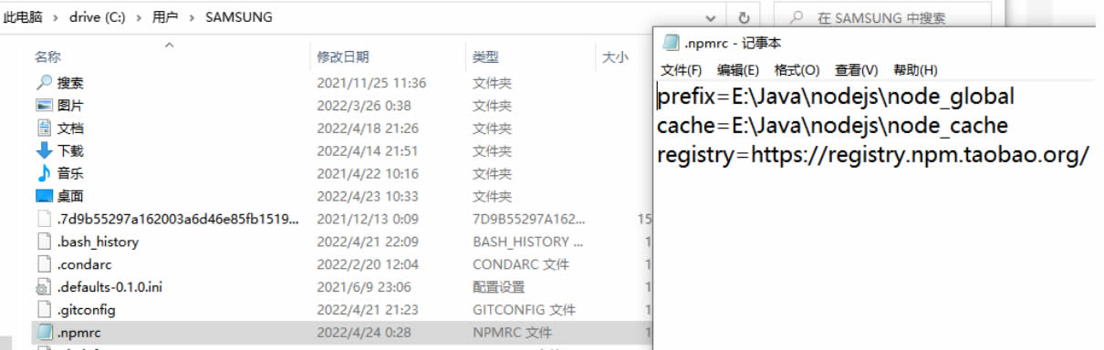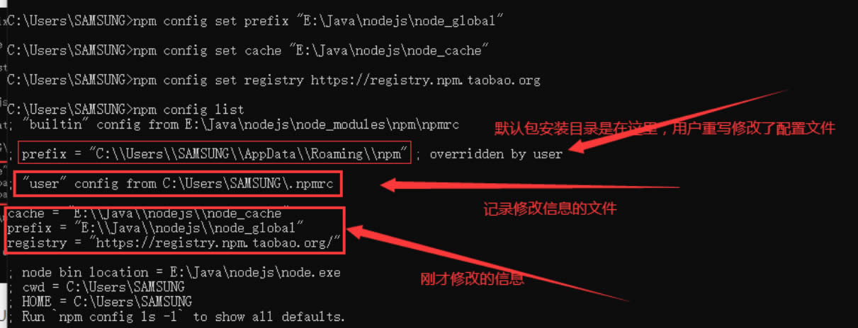 网上有些方法是删除C:\Users\用户名\下的.npmrc文件,万万不可这样,因为那个文件删除了,我们前面修改的全局模块目录和缓存目录配置就没了!!!到时候vue包就下载到C:\Users\你的用户名\AppData\Roaming\npm去了,也就是默认的地方去了,那我们前面修改就没意义了。