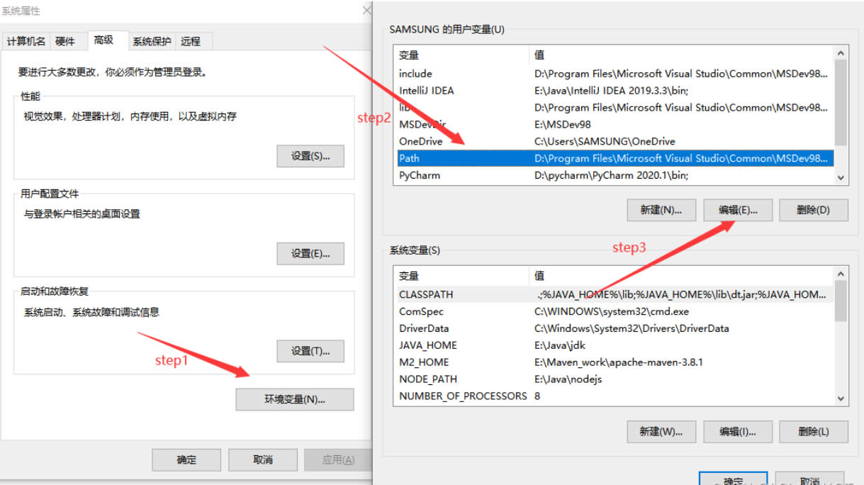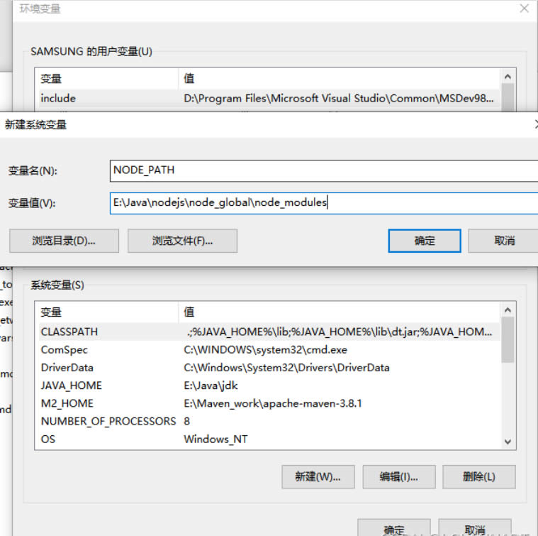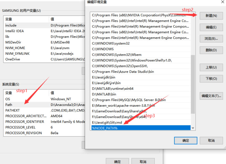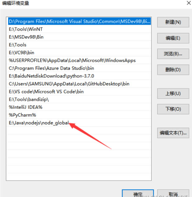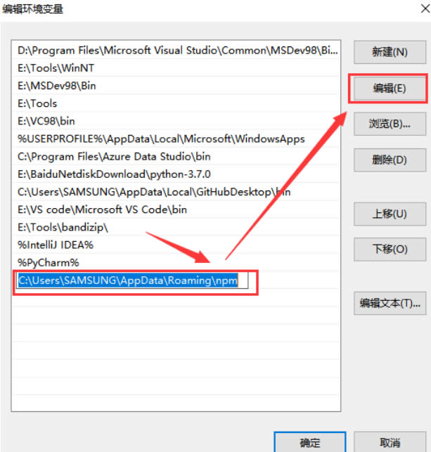 在安装过程中,自动配置了两个环境变量一个是环境变量—用户变量—Path里面的C:\Users\你的用户名\AppData\Roaming\npm另一个是环境变量—系统变量—Path里面的软件安装目录,我们需要增加和修改一下。1.环境变量—用户变量—选中Path—点编辑