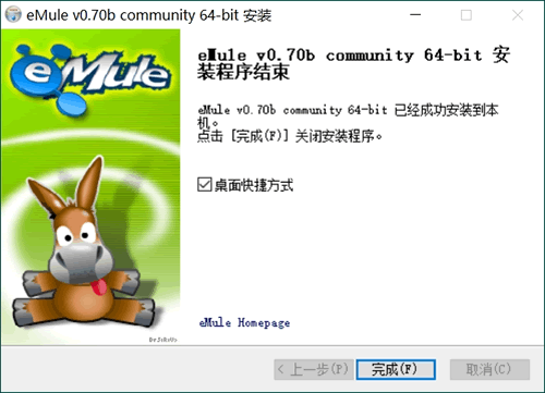 安装完成后,我们的桌面上会增加一个“驴头”标识的快捷方式,就是新安装的 eMule。