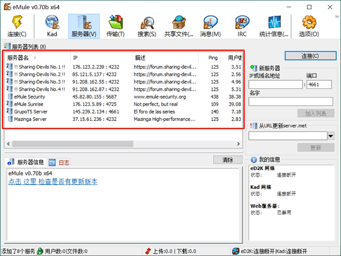 此时,启动 eMule 就可以看到可用的服务器资源了。