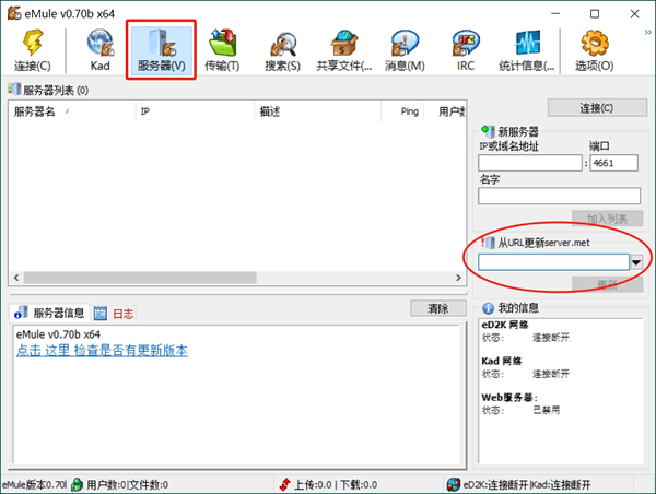 新安装的 eMule 要手动添加服务器资源,才能正常使用。添加的方法也很简单,启动 eMule,在菜单中依次找到“服务器->从URL更新server.met”,如下图所示: