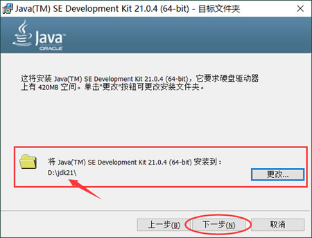 3) JDK21 默认安装到 C 盘,这里建议修改到其它非系统盘(安装位置一定要记住,后面配置环境变量会用到),比如我将其安装到了 D 盘: