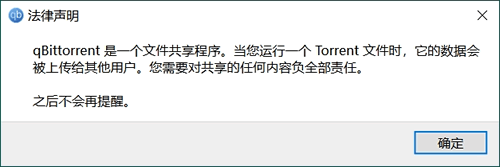 1) 启动 qBittorrent,首次开启会弹出下图的提示,点击“确定”即可: