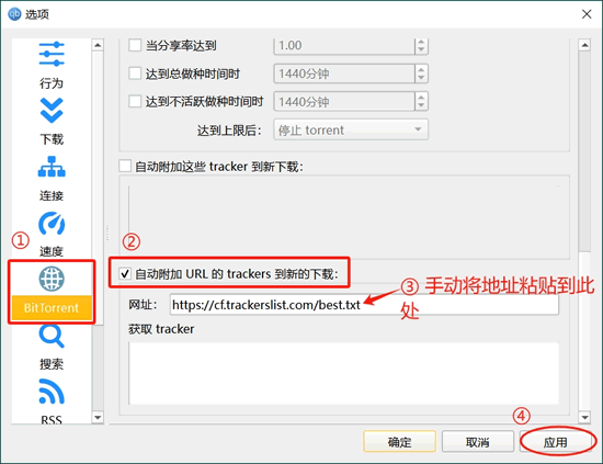按照下图所示,找到填写 tracker 地址的位置,这里分享两个主流的 tracker 资源: