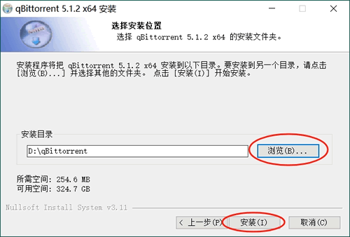 ⑤ 点击“浏览”按钮可以自定义 qBittorrent 的安装路径,建议安装到除 C 盘外的其它硬盘,比如图中的 D 盘,然后点击“安装按钮”: