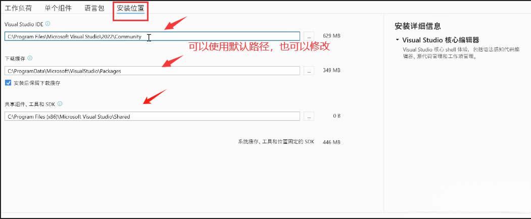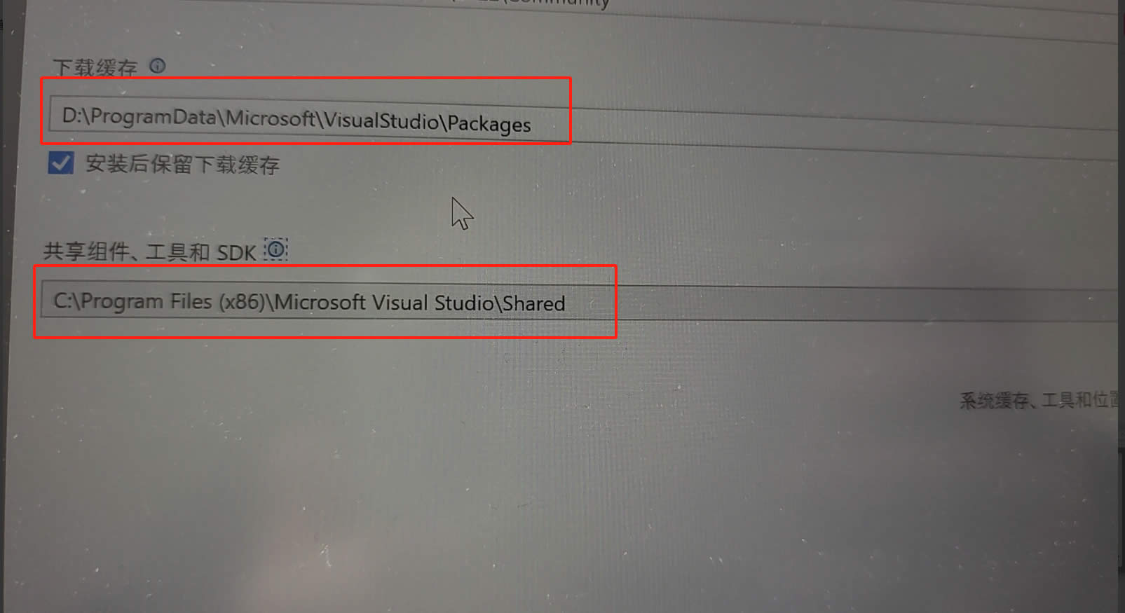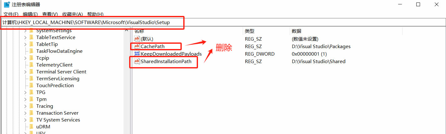 上述问题好解决,我们可以按win+R,输入regedit打开注册表,输入或找到计算机\HKEY_LOCAL_MACHINE\SOFTWARE\Microsoft\VisualStudio\Setup,右键CachePath和SharedInstallationPath,把这两个删除掉,删除之后,再此打开Visual Studio Installer,重新下载,此时就可以修改 下载缓存和共享组件、工具和SDK