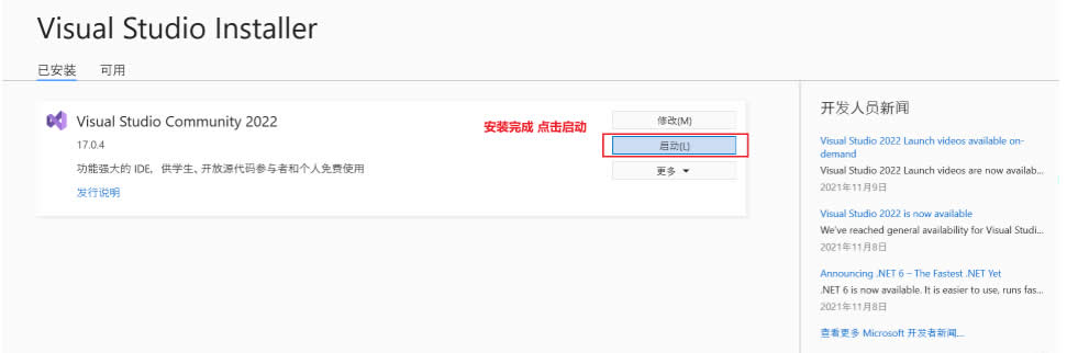一切都处理好后,我们在Visual Stdio 2022下载界面点击“安装”,等待片刻。安装好后点击启动,部分电脑需勾选 “安装后重启”,重启电脑后才能使用Visual Stdio 2022。