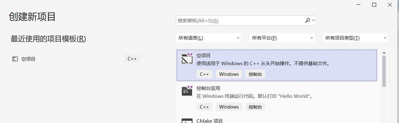 双击选择“空项目”(只有我们在前面工作负荷中选择了“使用C++的桌面开发”才有,一般初学C/C++都从这里进入开始编写代码)