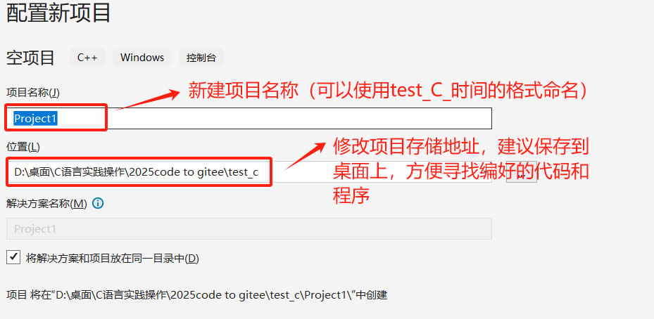 在这里我们还需要对新建的项目进行命名,笔者建议可以把项目命名为test_c_时间(便于C/C++学习时回顾),我们再把项目位置进行修改,建议在桌面上新建一个专门属于C/C++学习的文件夹,把代码都保存到该文件夹,方便寻找和学习。都处理好后,我们点击右下角的创建。