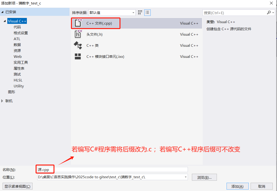 在这里我们选中C++文件(.cpp),由于C#和C++存在些许不同,若大家准备编写C#的程序,建议将下方的名称后缀改为.c ,这个后缀才是C#程序的专属后缀;若编写C++的程序,后缀可不做改变,最后点击右下角的添加,就可以开启独属于你的编程之旅啦!!