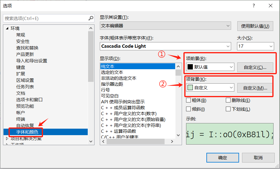 注:在“选项”界面找到“字体和颜色”(我们也可以在这里更改字体及大小),将项前景设置为“默认值”,点击项背景旁边的“自定义”选项,进行自定义设置。