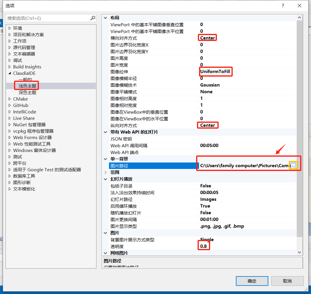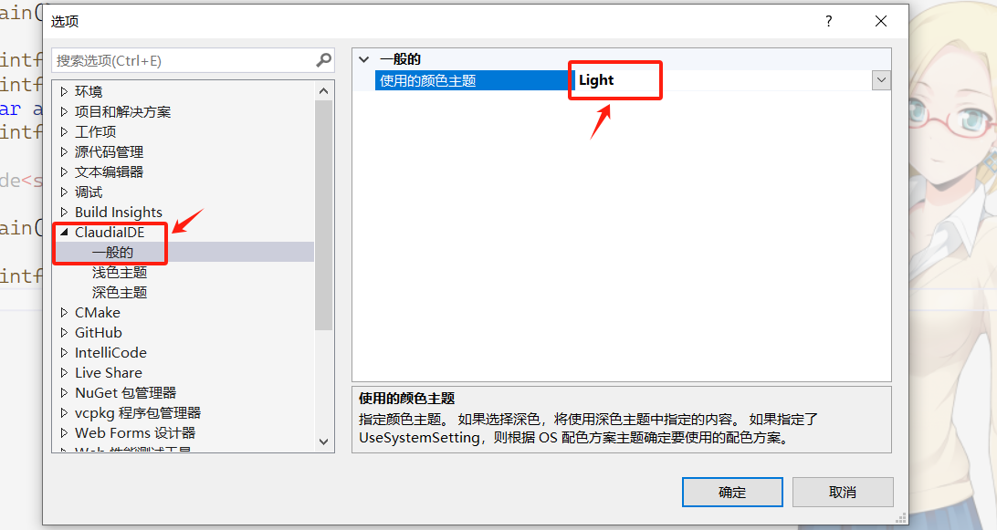 在这里我找到ClaudiaIDE查看“一般的”中所使用的颜色主题,若为Light我们就在浅色主题进行设置,若为“Dark”就在深色主题中进行设置。