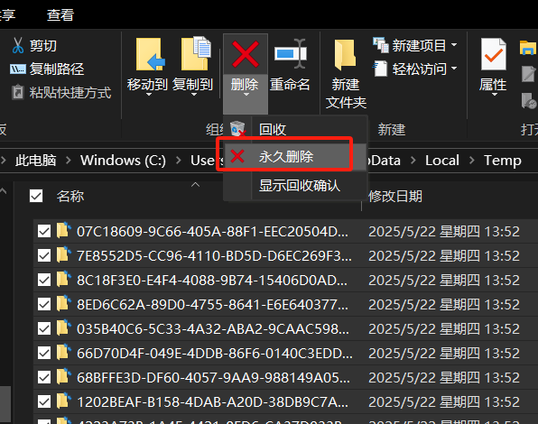 注:我们选中任意一个文件后,按住Ctrl+a键后全选,找到删除下的“永久删除”就可以清除电脑缓存(这里的文件可以放心大胆的删除,都是缓存文件除了占内存没有任何作用),清除电脑缓存后我们再尝试重新下载。