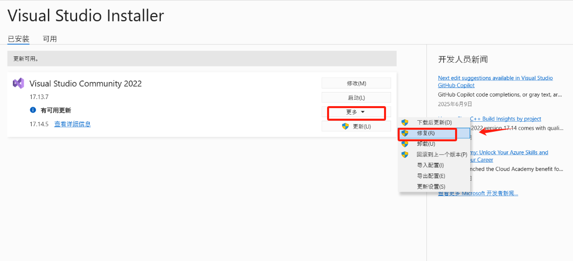 b) 我们找到并打开安装程序(Visual Studio Installer)----->点击“更多”→再点击“修复”后即可