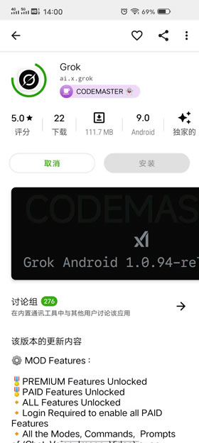 这里以下载 Grok 为例,载商品主页找到 Grok 后点进去,点击安装按钮,等待安装完成。