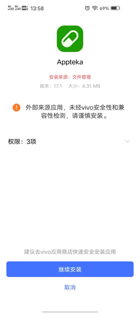 1) 安卓手机上下载名为“app-release.apk”的安装包文件,注意最后一定是 apk 结尾。2) 点击 apk 安装包,开始安装,由于此安装包不是应用商店下载的,所以系统会给出风险提示,点击“继续安装”即可: